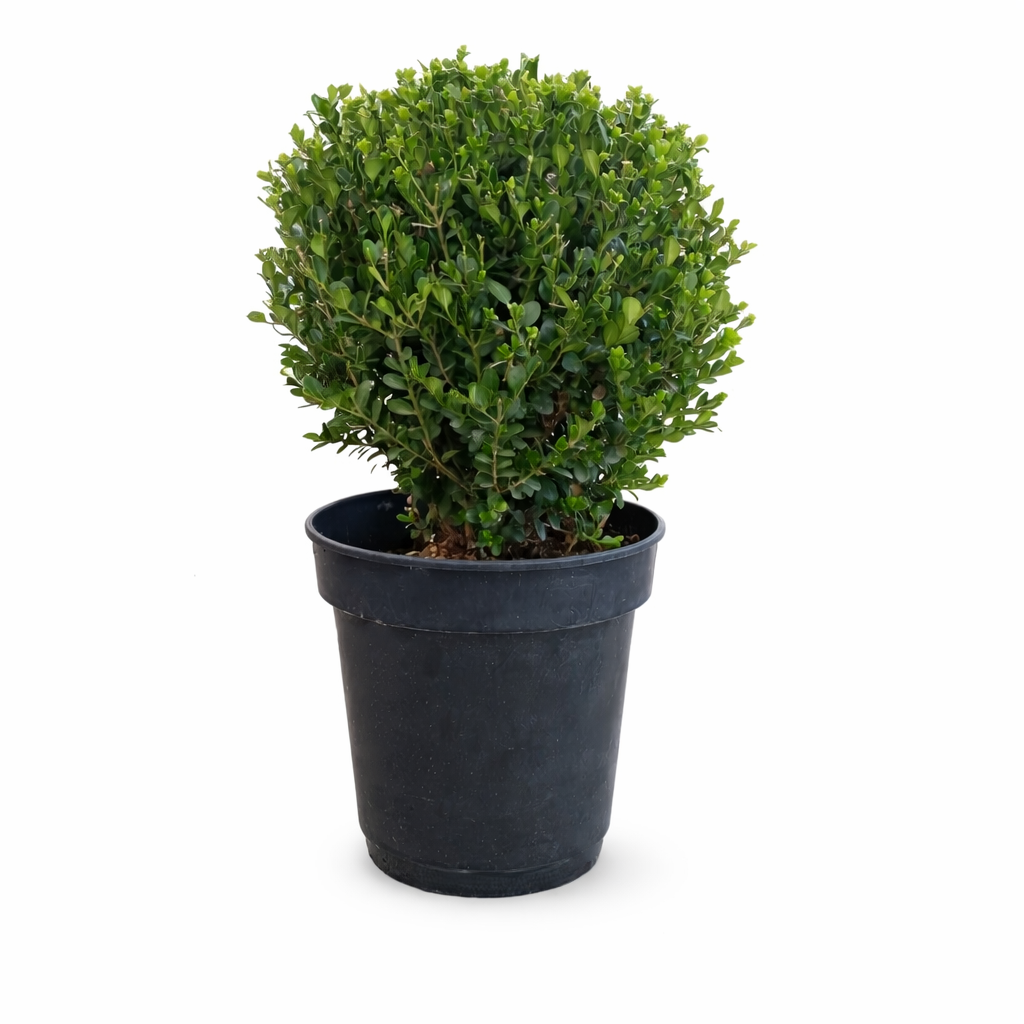 Buxus bilă este o plantă ornamentală mereu verde, tunsă în formă sferică, foarte apreciată pentru aspectul său elegant și ordonat. Este ideală pentru grădini, terase sau decorarea intrărilor.