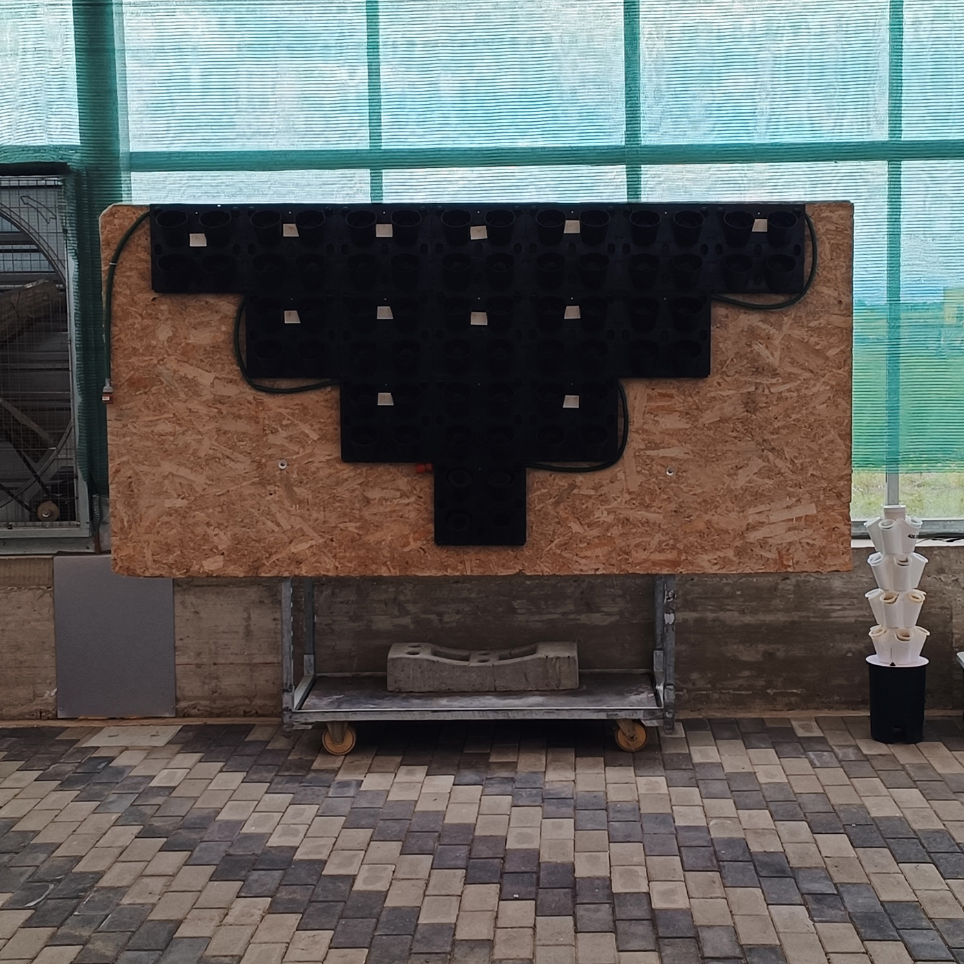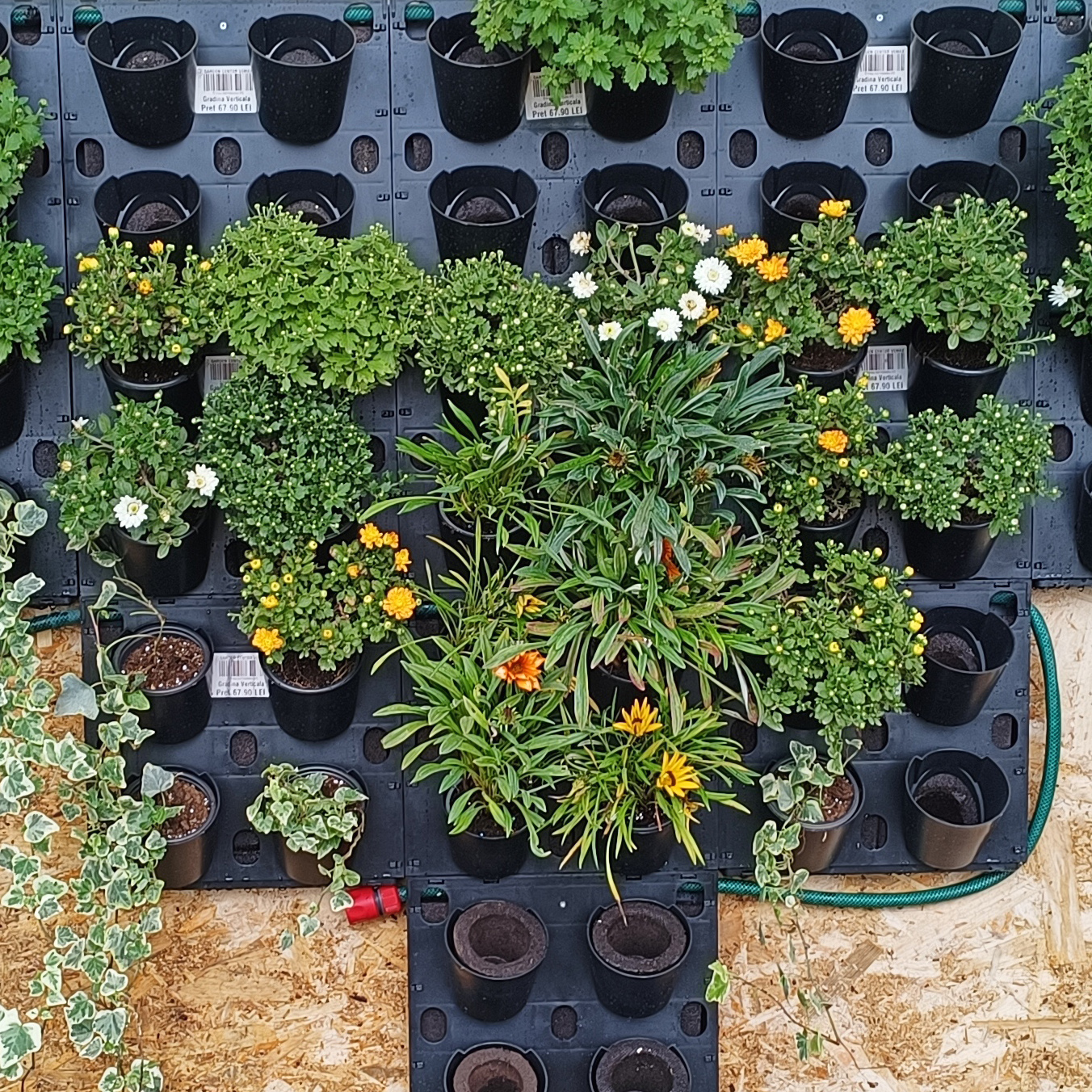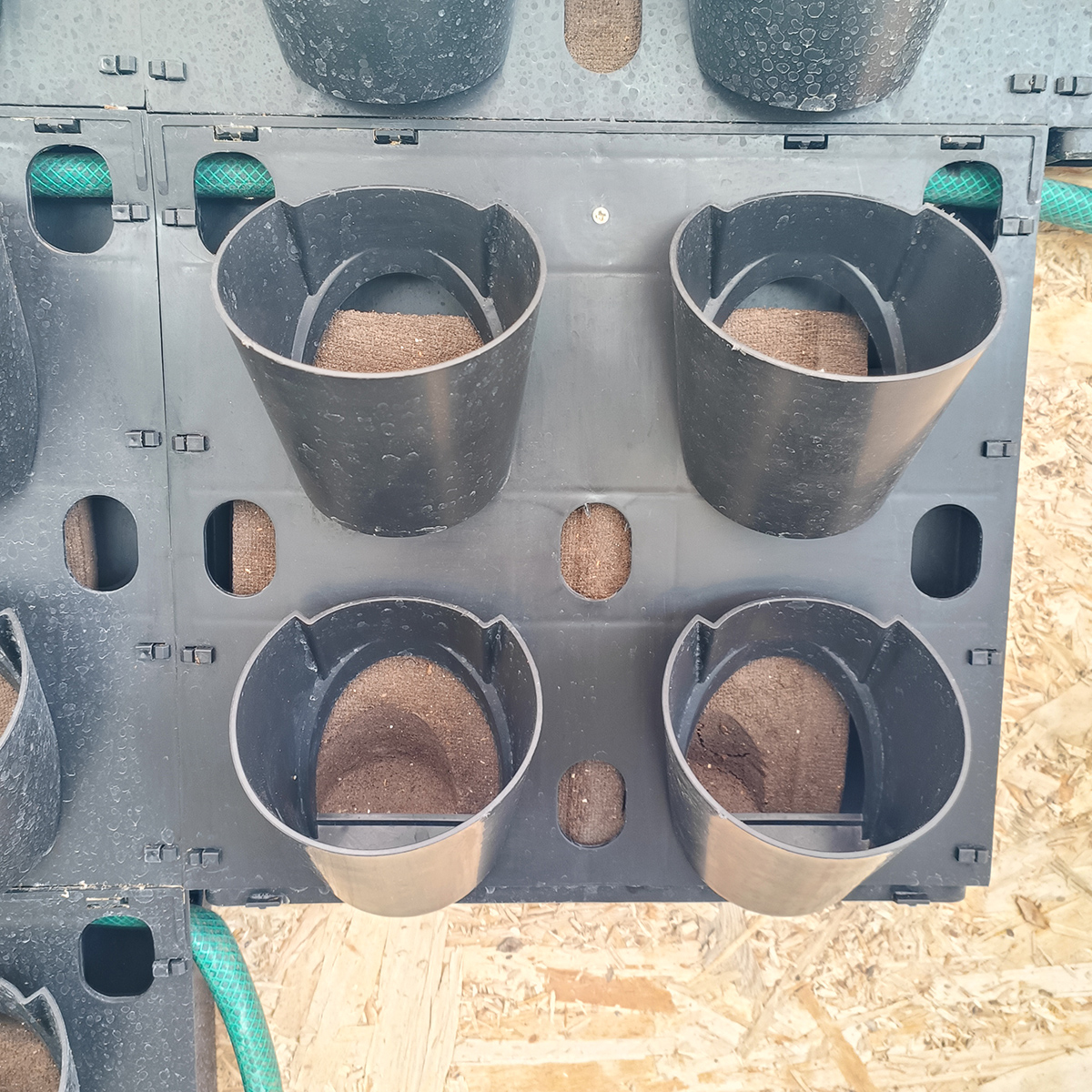 Set de 4 ghivece verticale cu suport pentru montare pe perete sau pe alte suprafețe verticale.