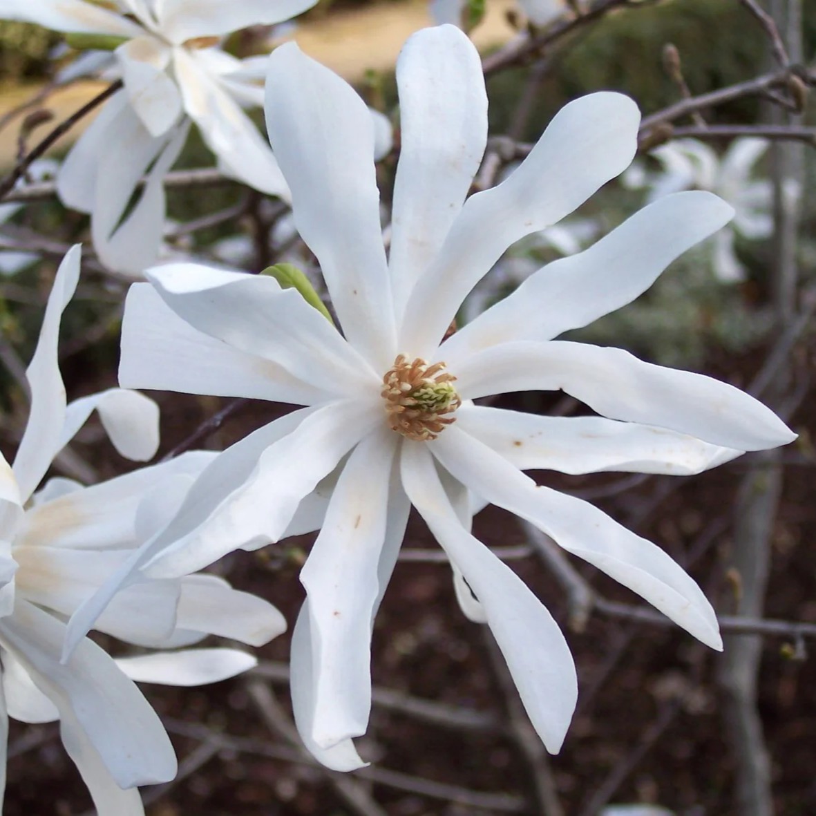 Magnolia stellata albă este un arbust ornamental compact, renumit pentru florile sale albe stelate, parfumate, care apar primăvara devreme înainte de frunze. Este ideală pentru grădini mici, borduri și spații decorative.