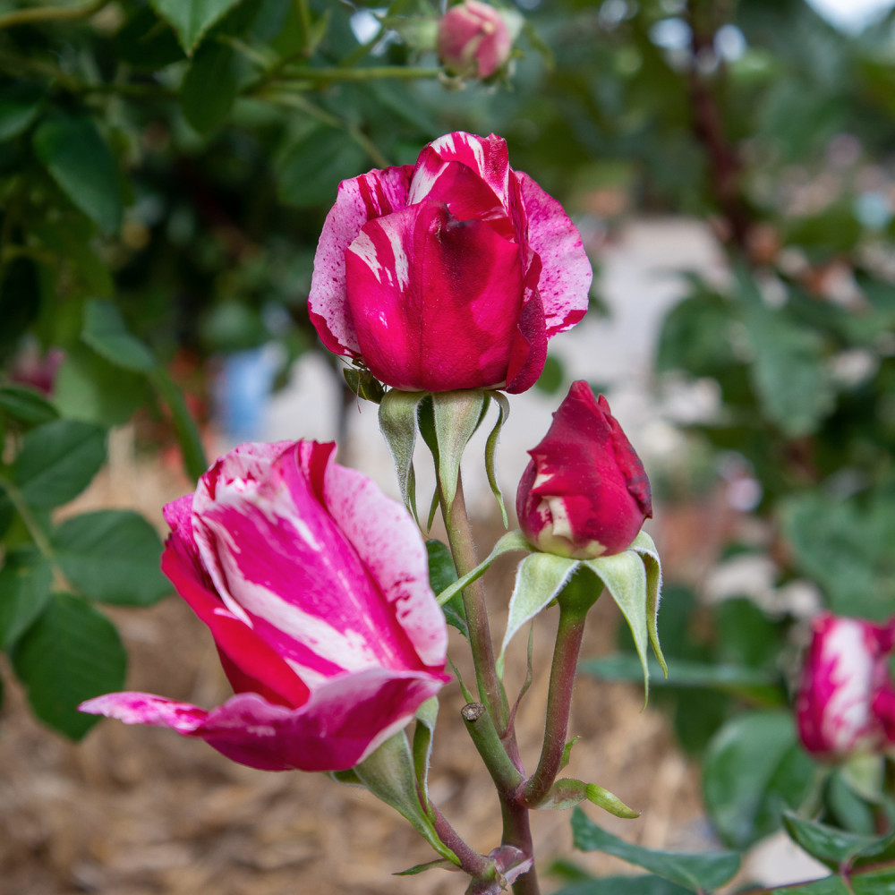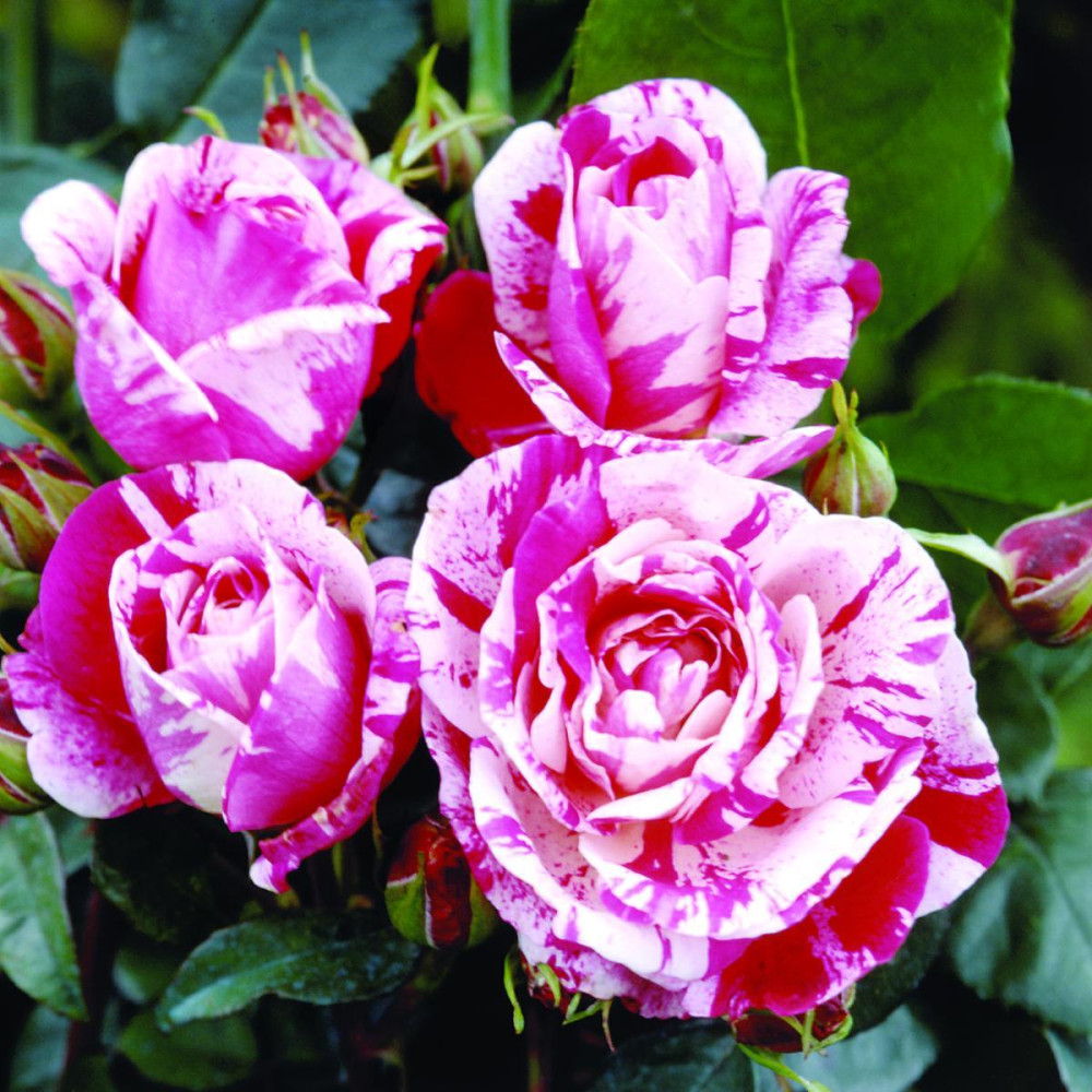 Acest trandafir este unic prin paleta sa de culori, combinând dungi roșu aprins și crem care dau impresia de petale pictate manual.